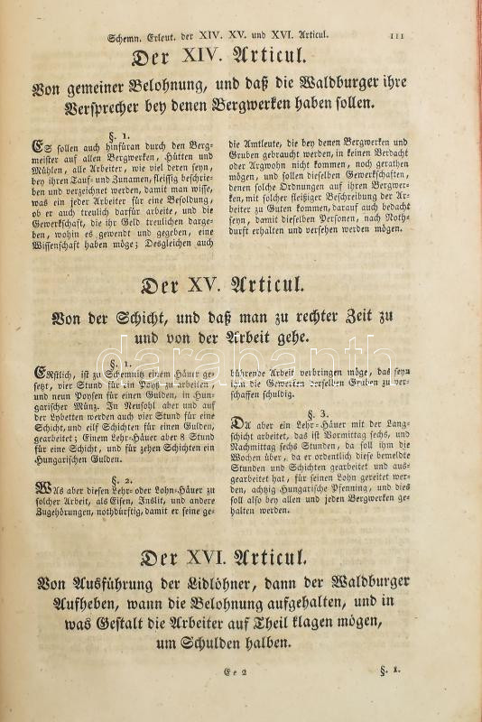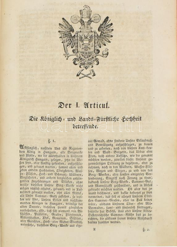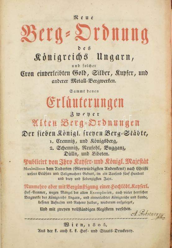 Neue Berg-Ordnung des Königreichs Ungarn, und solcher Cron einverleibten Gold, Silber, Kupfer, und anderer Metall-Bergwerken. Sammt denen Erläuterungen zweyer alten Berg-Ordnungen der sieben Königl. freyen Berg-Städte, 1. Cremnitz, und Königsberg, 2. Schemnitz, Neusohl, Bugganz, Dülln, und Libeten. Wien, 1805., K. K. Hof- und Staats-Druckerey, 5 sztl. lev.+150 p.+11 sztl. Német nyelven. Korabeli egészbőr-kötésben, kopott borítóval, a gerincen kis sérüléssel, a végén egy üres bekötött jegyzetlappal, valamint a végén benne néhány modern bányászati jellegű cikkel.