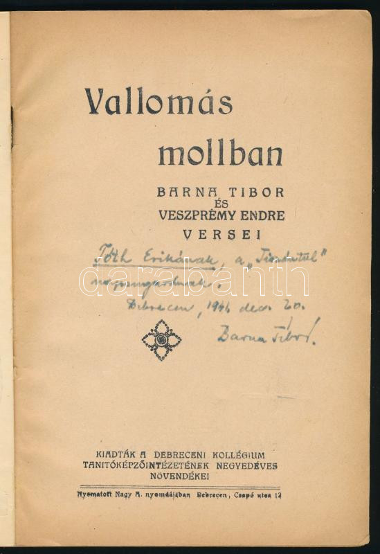 Barna Tibor - Veszprémy Endre: Vallomás mollban. - - és - - versei. Az... https://www.darabanth.com/en/484-Online-auction/484.0/Books/Books-Other-rarities~2000122/Barna-Tibor-Veszpremy-Endre-Vallomas-mollban--es--versei-Az-egyik-szerzo-Barna-Tibor~II3215488