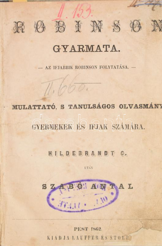 Description: [Hildebrandt, Johann Andreas Karl (1763-1846)]: Hildebrandt C.: Robinson gyarmata. Az ifjabbik Robinson folytatása. Mulattató, s tanulságos olvasmány gyermekek és ifjak számára. Pest, 1862, Lauffer és Stolp,3-140 p.+1 t. Kopott átkötött félvászon-kötésben, firkákkal, hiányos (181 oldalban teljes!)