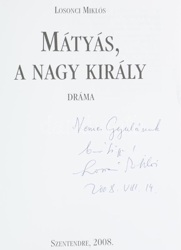 Losonci Miklós: Mátyás, a nagy király. Dráma. A szerző, Losonci Miklós... https://www.darabanth.com/en/484-Online-auction/484.0/Books/Books-Other-rarities~2000122/Losonci-Miklos-Matyas-a-nagy-kiraly-Drama-A-szerzo-Losonci-Miklos-1929-2010-muveszet~II3262435