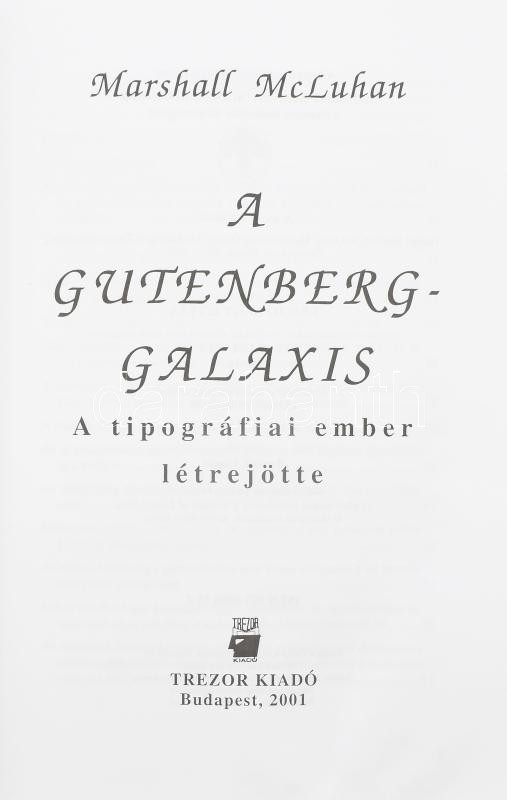 McLuhan, Marshall: A Gutenberg galaxis. A tipográfiai ember létrejötte... https://www.darabanth.com/en/484-Online-auction/484.0/Books/Books-Other-rarities~2000122/McLuhan-Marshall-A-Gutenberg-galaxis-A-tipografiai-ember-letrejotte-Bp-2001-Trezor-Kiado~II3255979