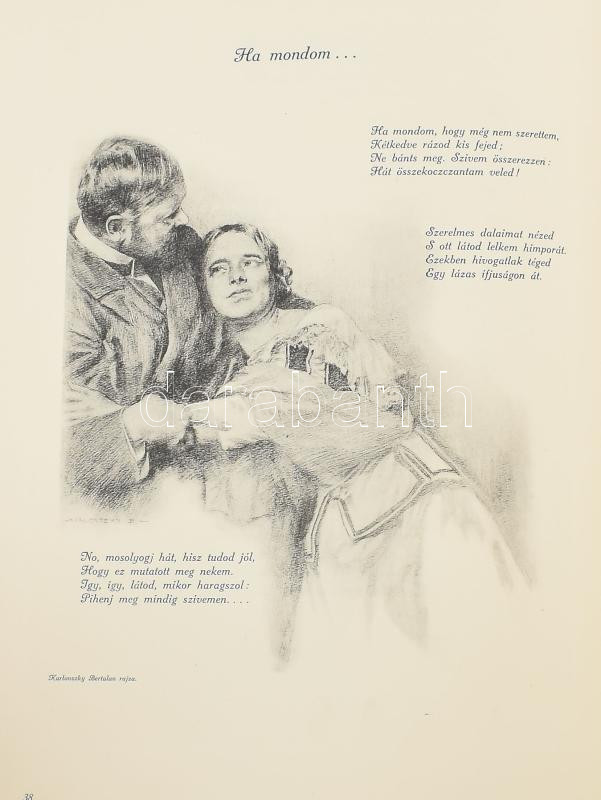Pap Zoltán: Muzsikaszó. Regény dalban. (Dedikált!) [Bp., 1911], Petőfi-Társaság (Athenaeum - Magyar Fénynyomda Rt.), 2 sztl. lev.+ 1 (címkép) t.+ 256 p.+ 18 t. (hiányos). Rendkívül gazdag szövegközti és egészoldalas, képanyaggal, többek közt Benczúr Gyula, Margitay Tihamér, Olgyay Viktor, Glatz Oszkár, Nyilassy Sándor, Nádler Róbert illusztrációival. A kötéstábla, az előzéklap és a könyvdíszek Basch Árpád munkái. Kiadói szecessziós, aranyozott, festett, dombornyomott egészvászon-kötés, Gottermayer-kötés, a borítón és gerincen kis sérülésekkel, foltokkal, némi kopással, néhány kijáró lappal/táblával, két táblán hiányzó képpel, egy lapról a képet kivágták, de megvan a könyvben. A szerző, Pap (Papp) Zoltán (1862-1919) ügyvéd, országgyűlési képviselő, költő, író, dalszerző, a Petőfi Társaság tagja által dedikált példány: ,,Balázs Béláné urnő Ő Méltóságának igaz tiszteletem jeléül Pap Zoltán".