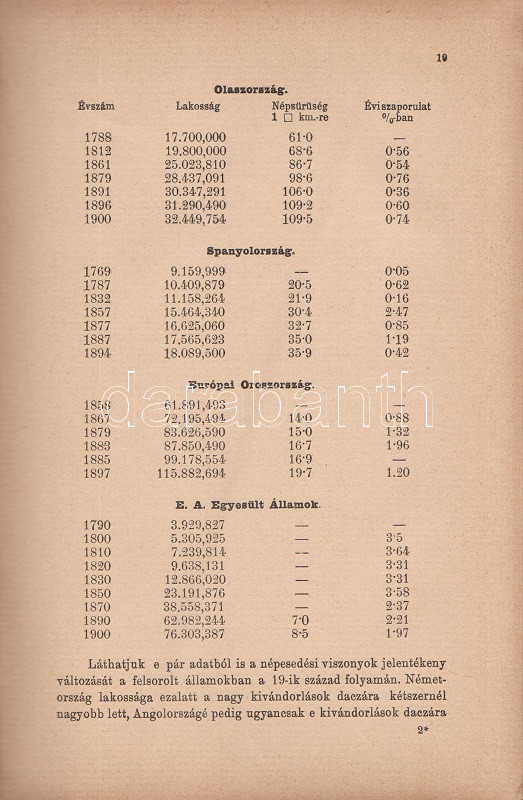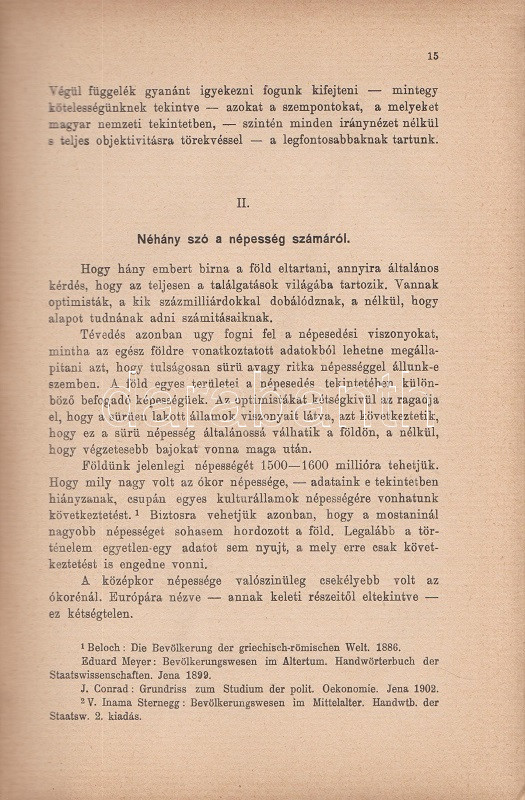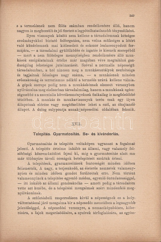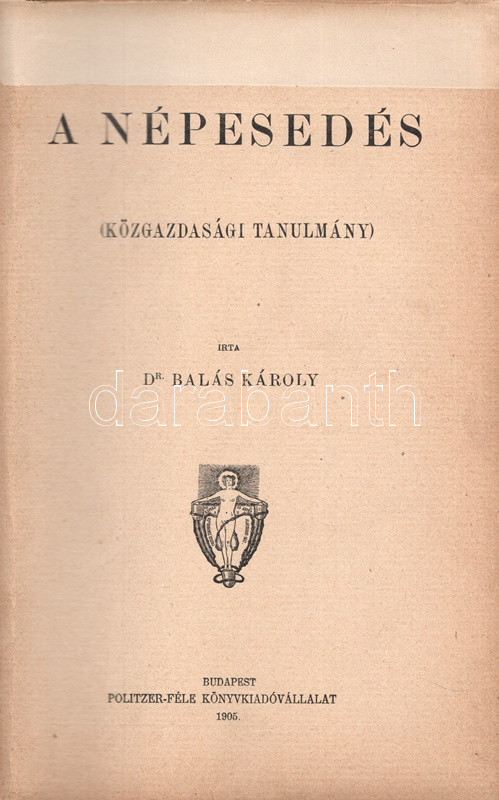 Balás Károly: A népesedés. (Közgazdasági tanulmány.) Budapest, 1905. Politzer-féle Könyvkiadóvállalat (Révai és Salamon könyvnyomdája). 541 + [3] p. Egyetlen kiadás. Balás Károly (1877-1953) közgazdász, jogász, a budapesti egyetemen a pénzügytan, a statisztika és a nemzetgazdaságtan tanára. Társadalomelméleti megalapozottságú népesedési monográfiája szociáldarwinista nézetekről tanúskodik, mely a nemzetek kíméletlen gazdasági versenyében nemzetjellemtani részleteket is feltételez. Balás Károly kötete a soknemzetiségű államok belül az államnyelven beszélő rétegek civilizációs fensőbbsége és az önkéntes nyelvi asszimiláció áldásos hatásai mellett érvel, Ázsia makrogazdasági vizsgálata esetén pedig a gyarmatosítók szervezési készségét és önzését állítja szembe a keleti civilizációk türelmével és évezredes tradícióival. A korabeli népesedéselmélet korjellemző, egyetemi szinten jegyzett munkája, mely az egyes államok szintjén az ipari munkásság önszerveződése mögött a birodalmi népesedéspolitikát felforgató ideológiai téveszméket azonosít. A címlapon felül apró pótlás, néhány levélen apró, a szövegtükröt nem érintő szakadásnyom, az első repülő előzék kijár a kötetből. Aranyozott, sérült gerincű korabeli félvászon kötésben. Jó példány.