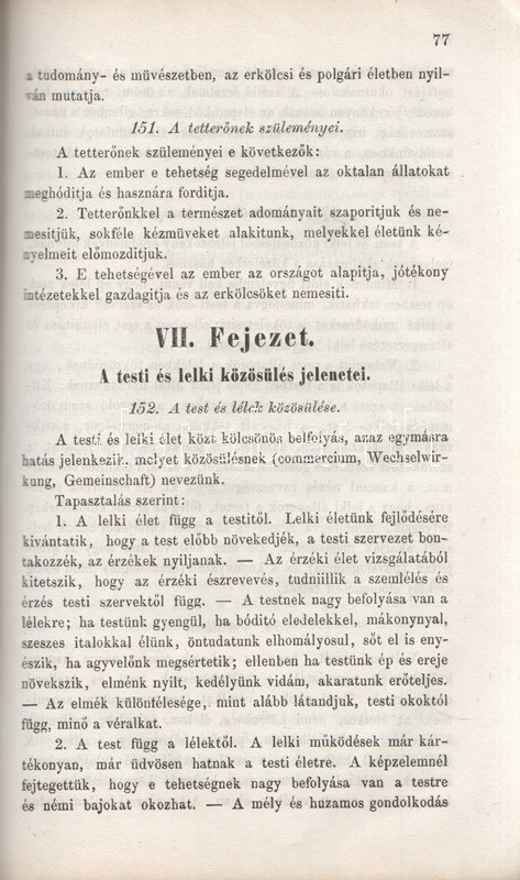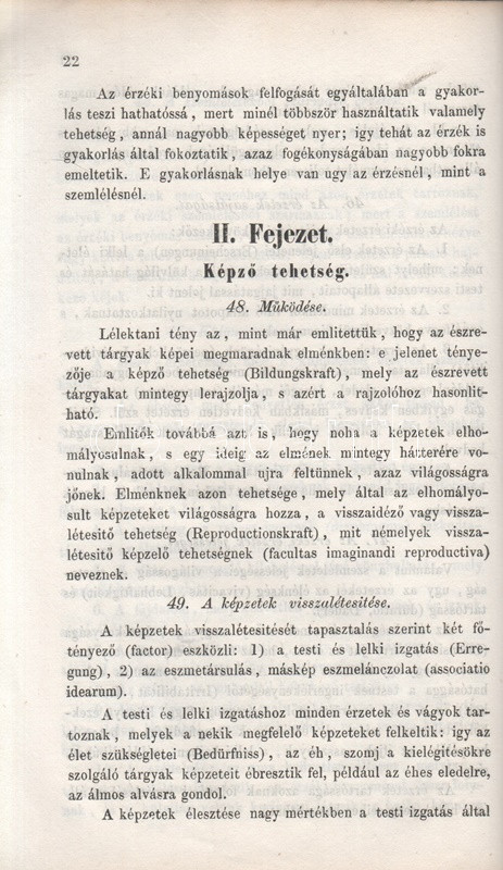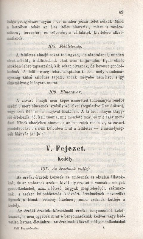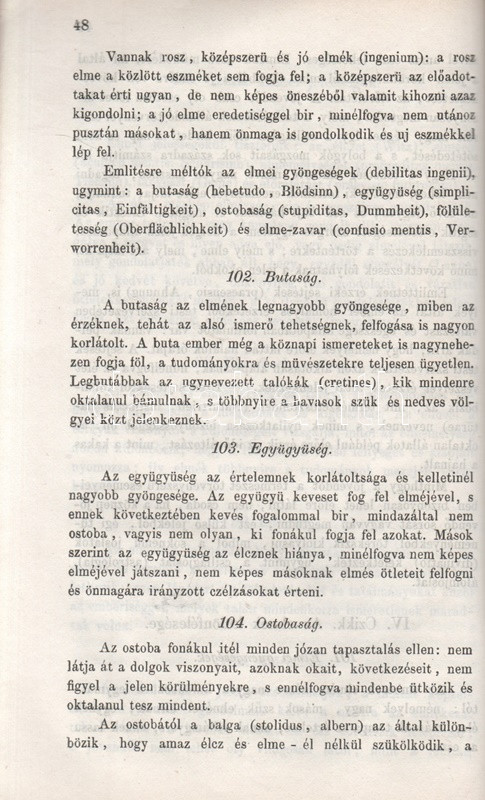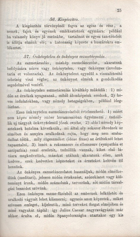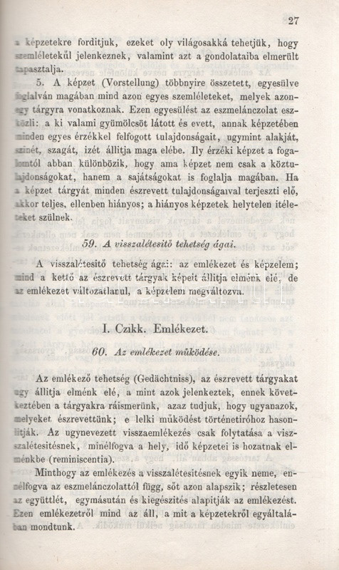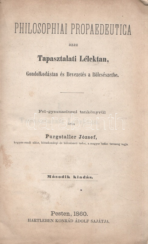 Purgstaller József: Philosophiai propaedeutica azaz Tapasztalati lélektan, Gondolkozástan és Bevezetés a bölcsészetbe. Fel-gymnasiumi tankönyvül írta Purgstaller József. Pesten, 1860. Hartleben Konrád Ádolf sajátja (Nyomtotta Sommer Lipót Bécsben). [4] + 159 + [1] p. Purgstaller József (1806-1867) piarista szerzetes, bölcseleti doktor, akadémiai tag, a piarista rend tartományfőnökének filozófiai értekezése először 1851-ben jelent meg, példányunk a második kiadásból származik. A munka első, lélektani tanulmánya századközépi módon értelmezi az emberi lélek és tudat alkatelemeit, az emlékezet, a képzelet, az asszociáció, a kedély, az indulatok, a szenvedélyek, ösztönök típusait. Purgstaller József értekezése segít a 19. századi közbeszéd egyes lélektani fogalmainak eredeti kontextus szerinti értelmezésében; ezeknek a fogalmaknak (például a kedély fogalmának) a jelentésköre mára teljesen átalakult. A lélektani értekezés kitér az akarat, az erény kérdéseire, a véralkat szerinti felosztásra, és olyan lélektani jelenségek nyomába ered, mint amilyen az álom, az ábrándozás és az elmeháborodás. Az értekezés második része bevezető a formális logikába, harmadik része pedig a tudományok felosztásának 1850 körüli látóhatárát rögzíti. Fűzve, kézzel feliratozott, enyhén foltos korabeli borítóban, márványmintás festésű lapszélekkel, az első borítón régi tulajdonosi bejegyzés. Jó példány.