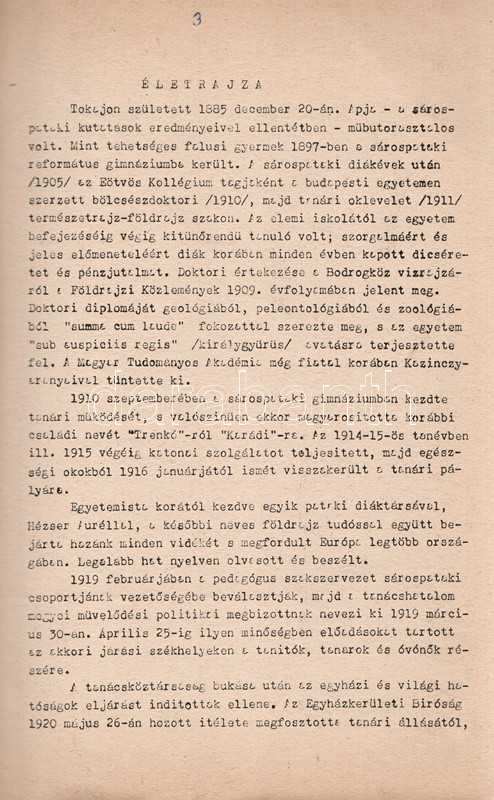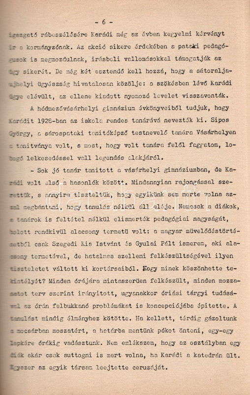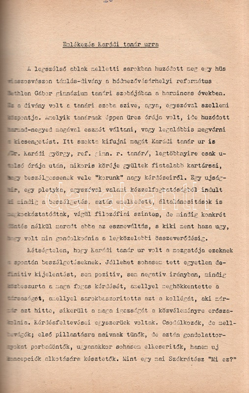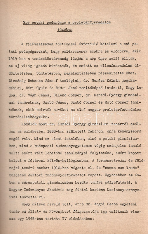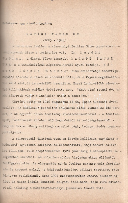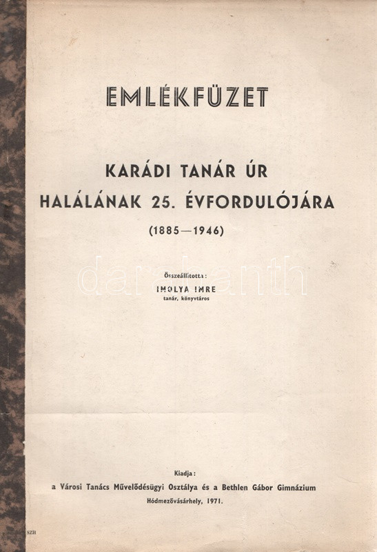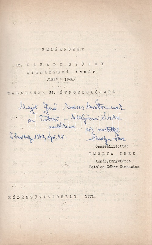 Imolya Imre (összeáll.): Emlékfüzet Karádi tanár úr halálának 25. évfordulójára (1885-1946). (Dedikált.) Hódmezővásárhely, 1971. Városi Tanács Művelődési Osztálya - Bethlen Gábor Gimnázium [ny. n.] [2] p. + 3-90 levél. Egyetlen kiadás. Összesen 230 példányban készült emlékkönyv dedikált példánya: "Major Jenő kedves barátomnak az Eötvös-kollégiumi évekre emlékezve sok szeretettel Imolya Imre. Hódmezővásárhely, 1972. ápr. 25." A kiadvány Karádi György (1885-1946) sárospataki, majd hódmezővásárhelyi pedagógus, földrajz-természetrajz szakos gimnáziumi tanár emléke előtt tiszteleg. A visszaemlékezéseket egykori tanítványai írták. Prov.: Major Jenő (1922-1988) településtörténész, földrajztudós, urbanisztikai szakíró. Fűzve, feliratozott, gerincén papír csíkkal erősített kiadói borítóban. Jó példány.
