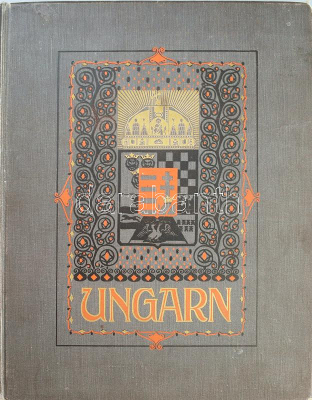 Kain, Albert: Ungarn. Im Auftrage des königlich Ungarischen Handelsministers herausgegeben von der Direktion der königlich Ungarischen Staatsbahnen. Unter Mitwirkung von Stefan Barsony, Julius Bodnar, Samuel Borovszky, Béla Erödi, Béla Gonda, Wilhelm Hanko, Ludwig Loczy, Theodor Novak, Willibald Semayer, Karl Siegmeth, Johann Sziklay, Ladislaus Toldy. Redigiert von Albert Kain. 700 Illustrationen und 1 Karte in 4 Farben. 2. Ausgabe. Stuttgart, 1911. Chr. Belser?sche Verlagsbuchhandlung,2+ 400 p. + 1 (kihajtható színes térkép, rajta a Szent Korona országaival) t. Oldalszámozáson belül Erdélyi Mór udvari fotográfus 700 szövegközti felvételével, szecessziós fejezetkezdő tollrajzokkal rendkívül gazdagon illusztrált Magyarország-album. Keretdíszes oldalakkal. A felvételek többsége a dualizmus korának civilizációs haladását hirdeti, a dualizmus városképei, főterei, vasúti portréi mellett a magyarországi fürdőhelyeknek, illetve az alföldi magyar parasztéletnek, mint nemzeti karakterisztikumnak szentel fő figyelmet. Kiadói aranyozott, festett, dombornyomású szecessziós egészvászon-kötés, a borítón a magyar nagy címerrel és a Szent koronával, kopott borítóval, kijáró lapokkal.