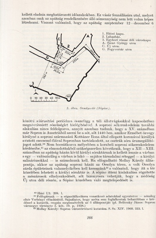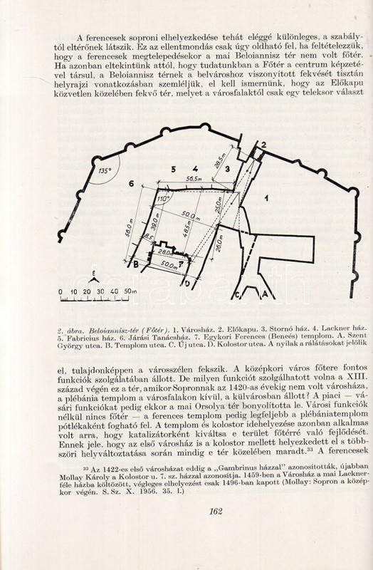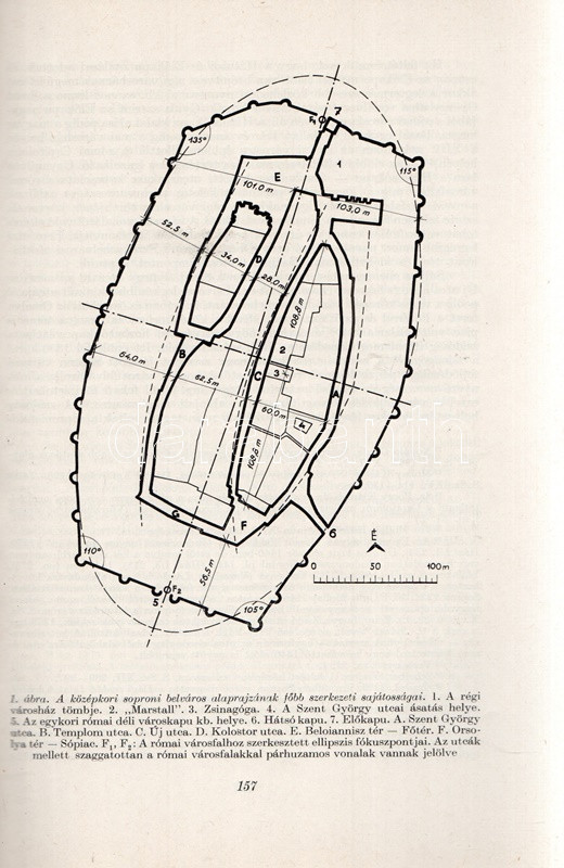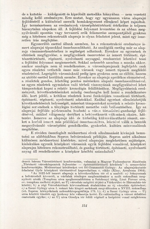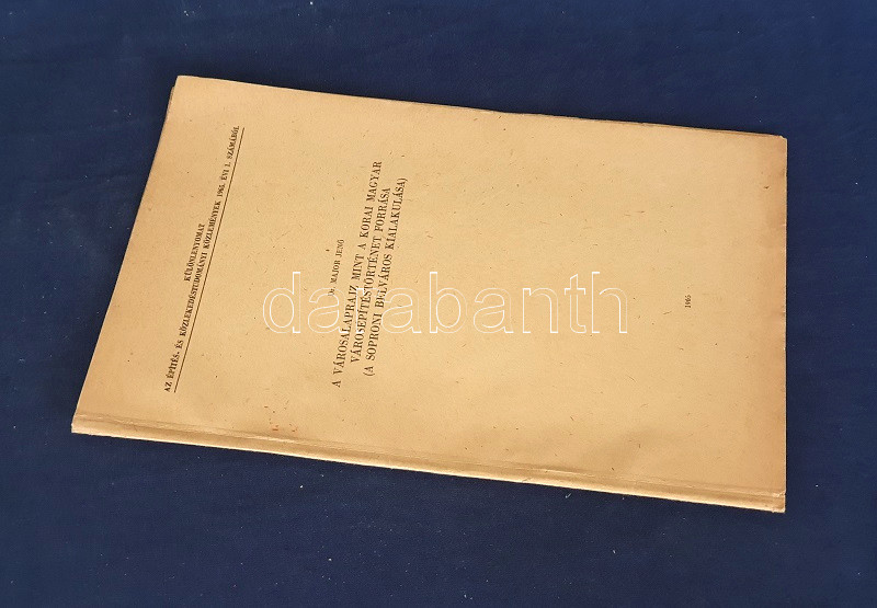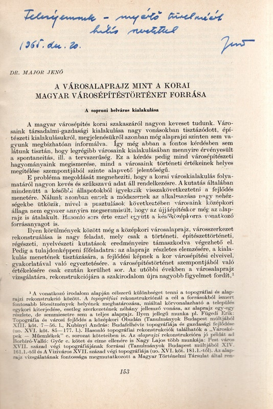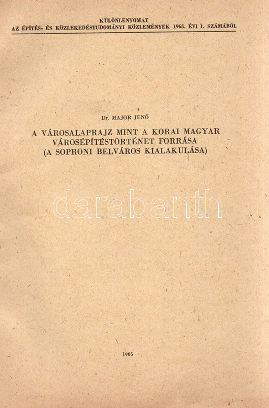 Major Jenő: A városalaprajz, mint a korai magyar városépítéstörténet forrása. A soproni belváros kialakulása. (Dedikált.) (Budapest), 1965. (Akadémiai Nyomda). 163-174 p. Egyetlen kötetkiadás. Dedikált: "Feleségemnek - megértő türelméért hálás szeretettel: Jenő. 1965. dec. 20." Major Jenő (1922-1988) településtörténész szövegközti alaprajzokkal illusztrált rövid történeti urbanisztikai tanulmánya Sopron városmagja kialakulásának rekonstruálására tesz kísérletet. A szerző külföldi analógiák nyomán arra a következtetésre jut, hogy a város az elpusztult római város falainak mentén éledt újjá, feltűnően sűrű városmagja viszont korábban üresen álló, lakatlan térség volt, ez üresen álló területen csak később kezdtek építkezni a frissen országba érkezett német telepesek. (Különlenyomat az Építés- és Építészettudományi Közlemények 1965. évi 1. számából.) Fűzve, kiadói borítóban. Jó példány.