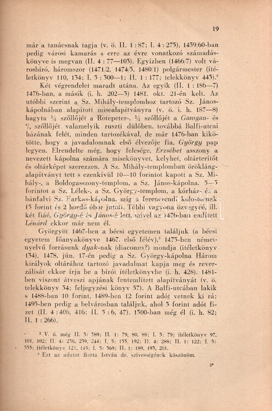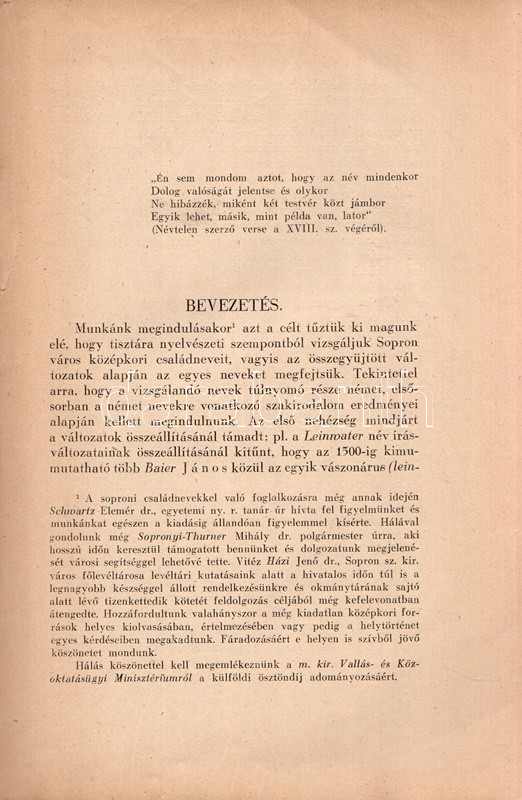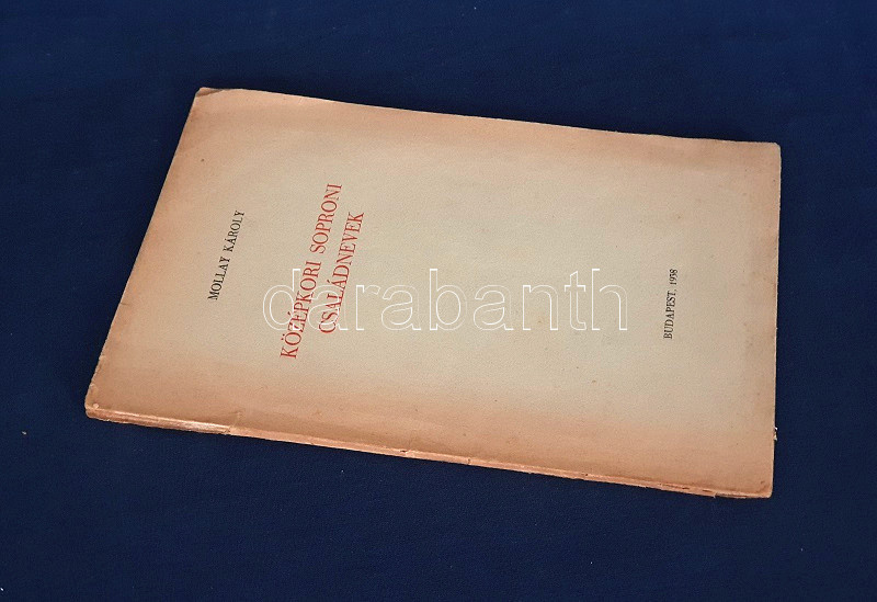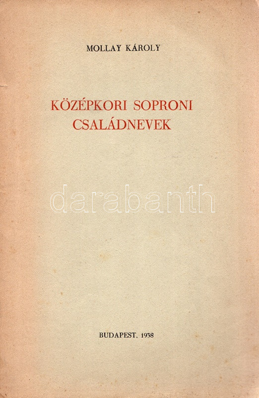 Mollay Károly: Középkori soproni családnevek. (Dedikált.) Budapest, 1938. (Szerző - Dunántúl Pécsi Egyetemi Könyvkiadó és Nyomda Rt.) 66 p. + 1 t. (kihajtható). Egyetlen kiadás. Dedikált: "Thier László úrnak, a soproni kultúra támogatójának tisztelettel. Mollay Károly." Mollay Károly (1913-1997) filológus, helytörténész, egyetemi tanár, a Soproni Szemle főszerkesztője. Nyelvészeti dolgozatában a hazai viszonyok között kiemelkedően jól dokumentált Sopron családneveinek kategorizálására törekszik, a telekkönyvek, ítélőkönyvek és más levéltári dokumentumok felhasználásával - a nyelvészeti tipologizálás közben pedig egyes nevezetes soproni családok történetét, karrierútjait és vagyoni helyzetét is rekonstruálja. Példányunk első fedőlapjának fűzése meglazult. Prov.: Thier László (1898-1960) soproni műgyűjtő, helytörténész, bibliográfus, az Ödenburger Zeitung szerkesztője. (Német nyelvészeti dolgozatok, 1.) Fűzve, feliratozott, enyhén sérült kiadói borítóban.