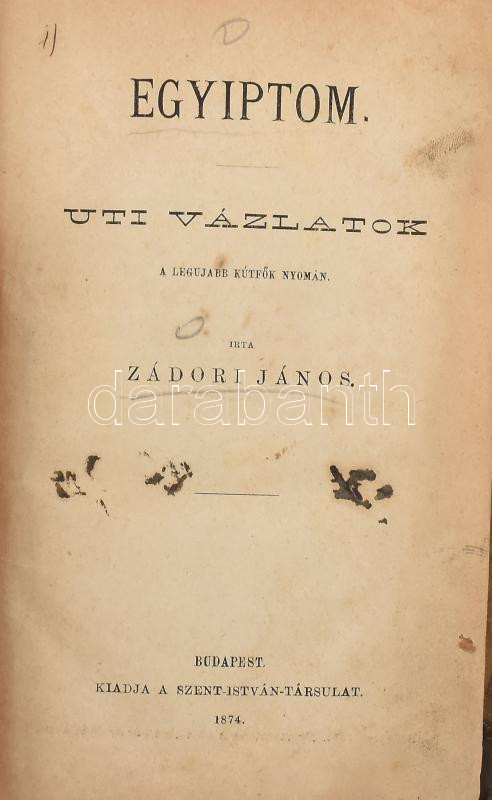 Zádori János: Egyiptom. Uti vázlatok. Házi könyvtár XVI. Éjszakafrikai úti vázlatok Zádori Jánostól I. Bp., 1874, Szent István-Társulat, X+2+259 p. Hozzákötve: Maszlaghy Xavér Ferenc: Délfrancziaországból. Uti vázlatok. Házi Könyvtár XX. Bp., 1875, Szent István-Társulat, XII+374 p. Átkötött félvászon-kötés, kopott borítóval, a hátsó táblán hiányos papírborítással, az elülső előzéklap szakadt, és mellette a címlap foltos.