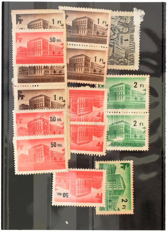 Szakszervezetek Központi Iskolája 50f- 2 ft tagsági bélyegek Alsó sor egymásra ragasztva