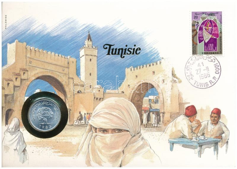 Tunézia 1983. 5M, felbélyegzett borítékban, bélyegzéssel, német nyelvű... https://www.darabanth.com/en/484-Online-auction/484.0/Numismatics/Envelopes-with-Coins-and-Banknotes~500005/Tunezia-1983-5M-felbelyegzett-boritekban-belyegzessel-nemet-nyelvu-leirassal-TUNC-Tun~II3264994