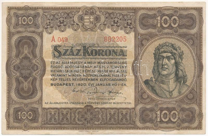 https://www.darabanth.com/en/484-Online-auction/484.0/Numismatics/Hungarian-Banknotes~500008/1920-100K-Orell-Fussli-Zurich-nyomdahely-jelolessel-A-049-882205-TF-kis-beszakadas-amug~II3309953