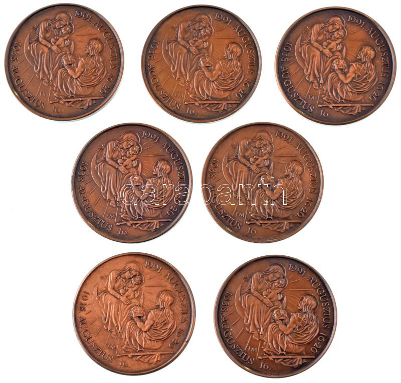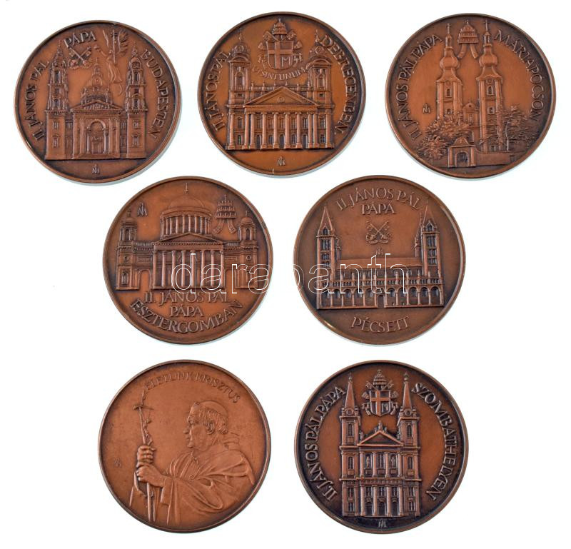 Fritz Mihály (1947-) 1991. "II. János Pál Pápa Budapesten" kétoldalas bronz emlékérem (42,5mm) + "II. János Pál Pápa Máriapócson" kétoldalas bronz emlékérem (42,5mm) + "II. János Pál Pápa Esztergomban" kétoldalas bronz emlékérem (42,5mm) + "II. János Pál Pápa Pécsett" kétoldalas bronz emlékérem (42,5mm) + "II. János Pál Pápa Debrecenben" kétoldalas bronz emlékérem (42,5mm) + "II. János Pál Pápa Szombathelyen" kétoldalas bronz emlékérem (42,5mm) + "1038. augusztus 16. - 1991. augusztus 16-20 / Életünk Krisztus" kétoldalas bronz emlékérem (42,5mm) T:UNC-AU