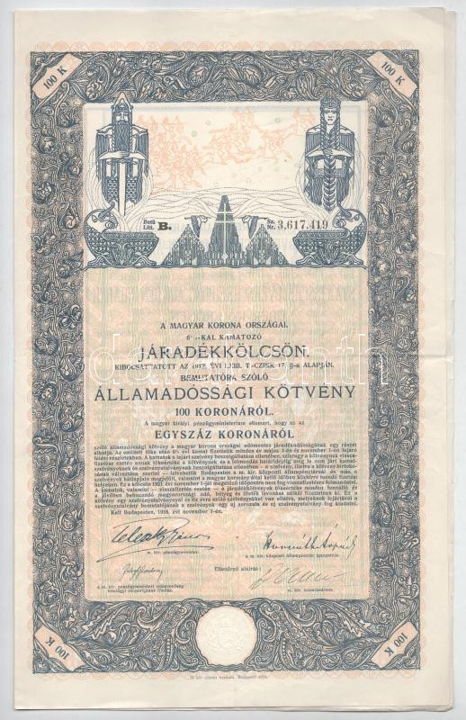 Budapest 1914-1917. "A Magyar Korona Országai 6%-kal kamatozó Járadékkölcsön" bemutatóra szóló államadóssági kötvénye 100K-ról + 1000K-ról (2xklf), szárazpecséttel, bélyegzéssel, szelvényekkel + "A Magyar Korona Országai 5 1/2%-kal kamatozó Járadékkölcsön" bemutatóra szóló államadóssági kötvénye 100K-ról + 1000Król + 10.000K-ról (3xklf), szárazpecséttel, bélyegzéssel, szelvényekkel + 1918. "A Magyar Korona Országai 5 1/2%-kal kamatozó Járadékkölcsön" bemutatóra szóló államadóssági kötvénye 100K-ról szárazpecséttel, bélyegzéssel, szelvényekkel T:F, szép papír, pici szakadások