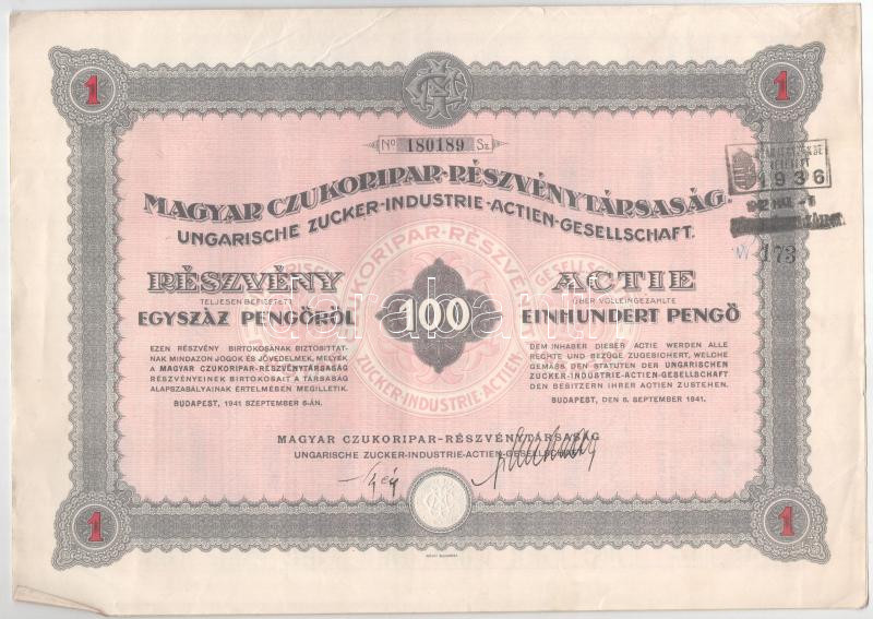 https://www.darabanth.com/en/484-Online-auction/484.0/Numismatics/Shares-and-Tickets~500006/Budapest-1941-Magyar-Czukoripar-Reszvenytarsasag-reszvenye-100P-rol-szelvenyekkel-szara~II3221040