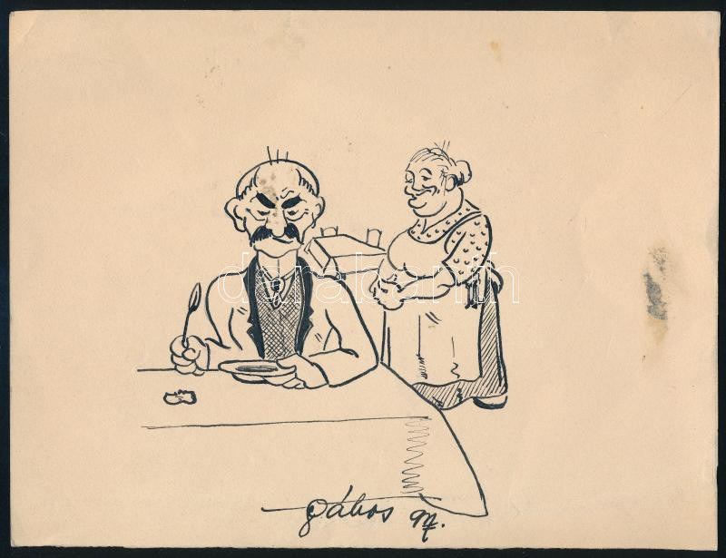 Olvashatatlan (Gábos gy?) jelzéssel: Tele a tányér (illusztráció v. karikatúra?). Tus, papír. Lap széle kissé foltos. 15x20 cm