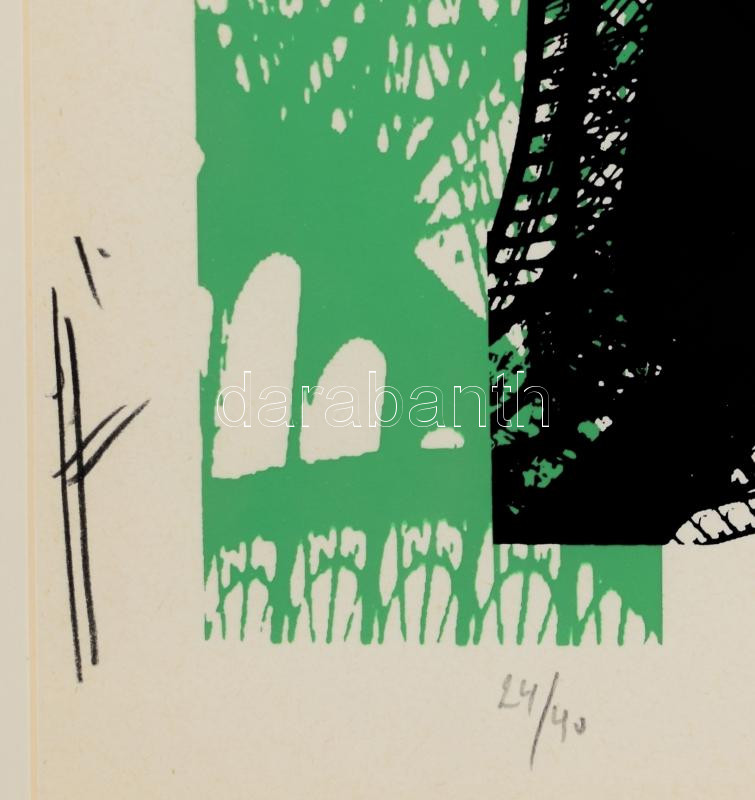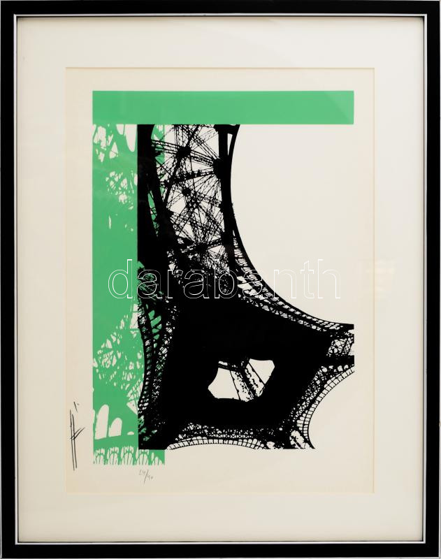 Hervé, Rodolf (1957-2000): Eiffel-torony zöldben. Szitanyomat, papír, jelzett, számozott: 24/40. 36x21 cm. Üvegezett fakeretben. / Hervé, Rodolf (1957-2000): Eiffel-tower. Screenprint on paper, signed, numbered: 24/40, 35x24,5 cm. Framed.