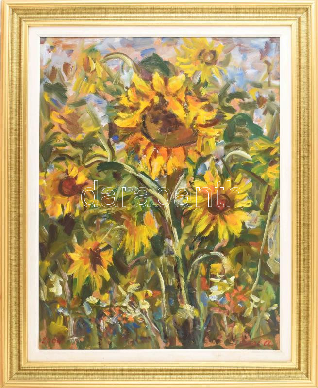 Pócsai András (1934-2021): Napraforgók, 2004. Olaj, farost. Jelezve jobbra lent. 61,5x47,5 cm. Dekoratív fakeretben.