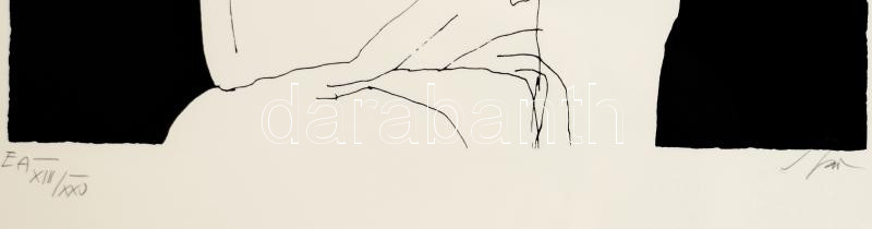 Description: Szász Endre (1926-2003): Illusztráció Francois Villon művéhez. Szitanyomat, papír, jelzett, művészpéldány EA XIII/XXV számozással. Hátoldalán Faludy György autográf aláírásával. Az 1996-ban megjelent Francois Villon balladái Faludy György átköltésében c. mappából. 41x29,5 cm. Üvegezett fakeretben.