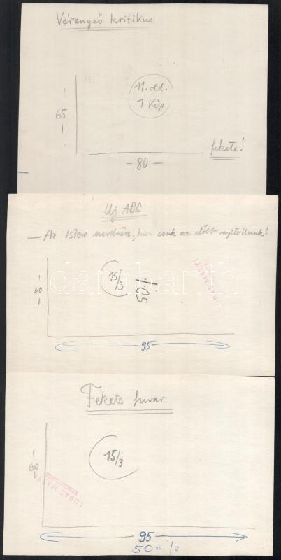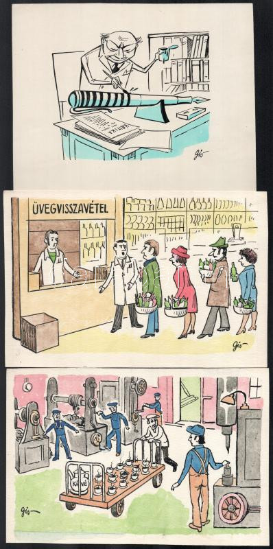 SzegÅ‘ Gizi (1902-1985): 7 db karikatúra. Vegyes technika, papÃr, jelzett, egy kivételével "Ludas Matyi SzerkesztÅ‘sége" vagy "Ludas Magazin" bélyegzÅ‘vel. Megjelent karikatúra. 14x20 és 18x23 cm közötti méretekben