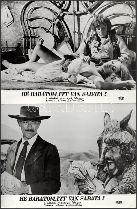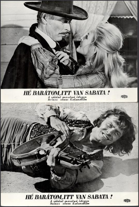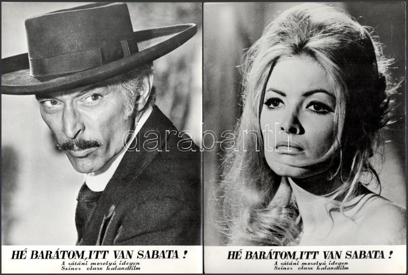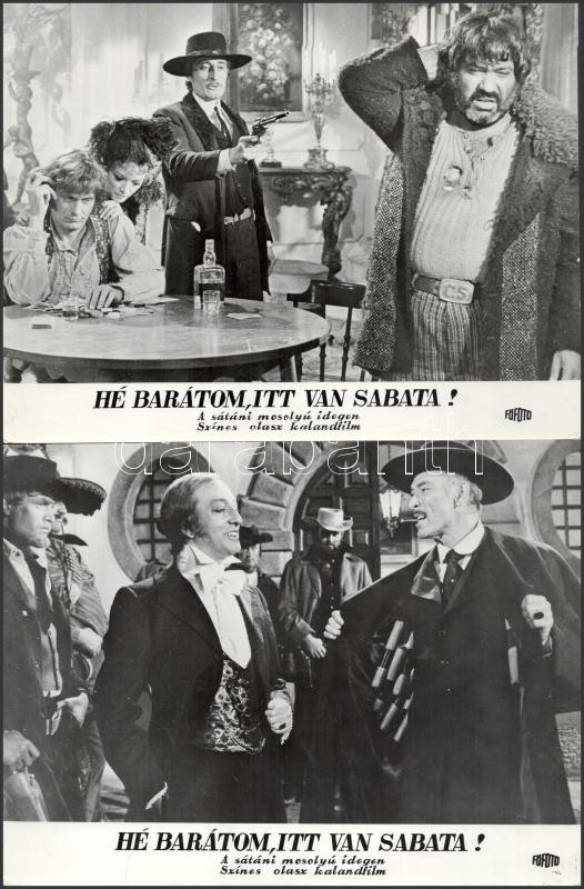 cca 1989 előtt készült, ,,Hé barátom, itt van Sabata!" című olasz film jelenetei és szereplői, 13 db vintage produkciós filmfotó (vitrinfotó, lobbyfotó) ezüst zselatinos fotópapíron, a használatból eredő (esetleges) kisebb hibákkal, 18x24 cm