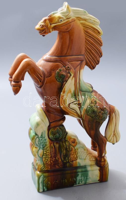 Kínai mázas kerámia ágaskodó ló, jelzett, horzsolással, m: 39 cm
