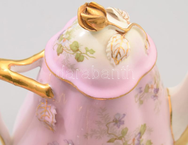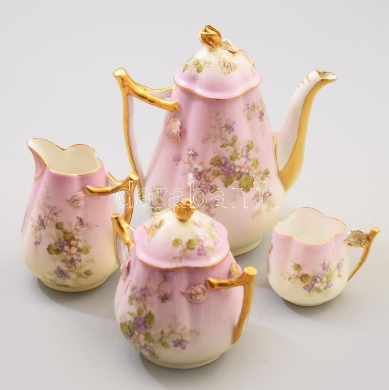 Meisseni porcelán mokkás készlet, Hiányos, négy darabos: kanna, cukordoboz, tejkiöntő, csésze Szecessziós, kézzel festett, jelzett, kopással Kanna 16 cm