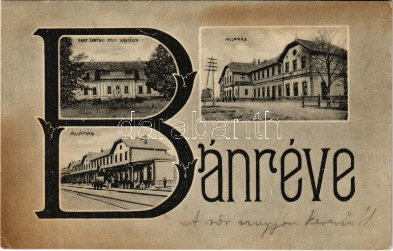 1908 Bánréve, Gróf Serényi Béla kastélya, vasútállomás. Szabó Győző kiadása. Iniciálés szecessziós lap (fl)