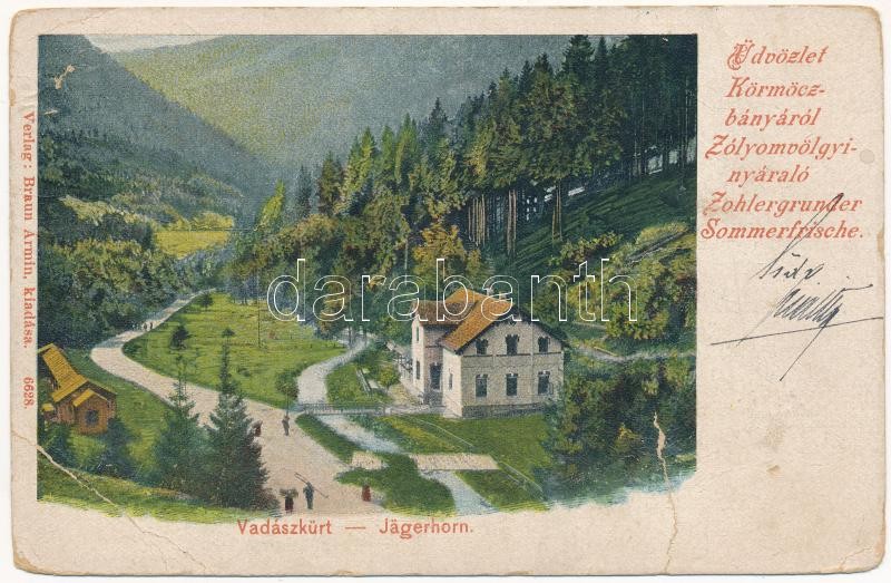 1904 Körmöcbánya, Kremnitz, Kremnica; Zólyomvölgy, Vadászkürt szálloda és nyaraló. Braun Ármin kiadása / Zohlergrunder Sommerfrische, Jägerhorn / hotel and villa (b)