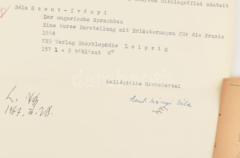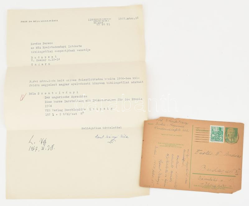 1959-1967 Prof. Dr. Szent-Iványi Béla autográf képeslapja Vértes O. András (1911-1997) nyelvész részére, és Kovács Ferenc az MTA Nyelvtudományi Intézete bibliográfiai csoportjának vezetője részére