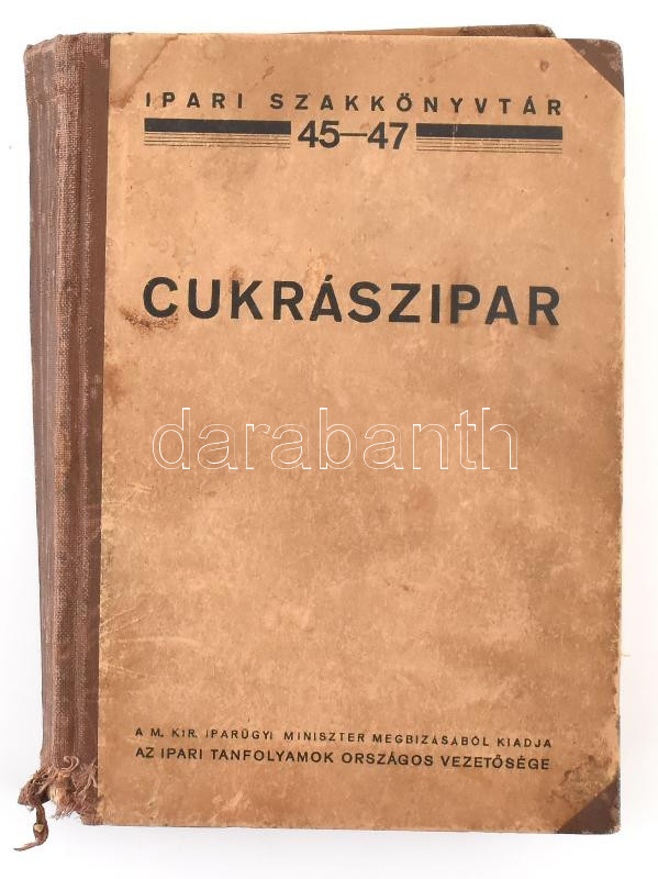 Szilassy Alfonz: Cukrászipar. I. Anyagismeret, II. Üzemtani ismeretek, III. Termelés, IV. Árszabás, V. Az ipar gyakorlása. Ipari szakkönyvtár 45-47. Bp.,é.n.,Ipari tanfolyamok Országos Vezetősége, (Pallas-ny.), 260 p. Kiadói félvászon-kötés, kopott, foltos borítóval, a gerincen kis sérüléssel, a címlapon apró szakadással.