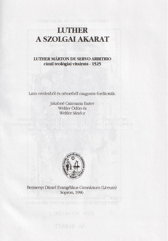 Kolofon: "Készül 50 számozott és 1450 számozatlan példányban. [Ez a könyv a] 7. [számú példány]." Luther Márton komoly felbolydulást jelentő teológiai fellépése nyomán Rotterdami Erasmus, a számos európai udvarba bejáratos humanista 1524-ben kiadta "Diatribe de libero arbitrio" (Értekezés a szabad akaratról) című elleniratát. Luther válaszképpen jelentette meg szenvedélyes hangon írt vitairatát "De servo arbitrio" (A szolgai akarat) címmel. Szövegünknek ez az első teljes magyar kiadása, latin eredetiből és németből Jakabné Csizmazia Eszter, Weltler Ödön és Weltler Sándor fordították. Oldalszámozáson belül Széll György grafikusművész egész oldalas grafikáival.