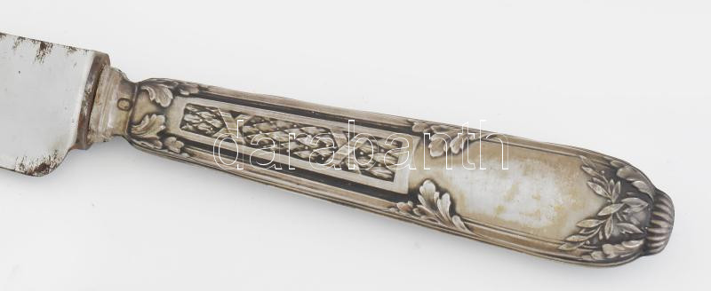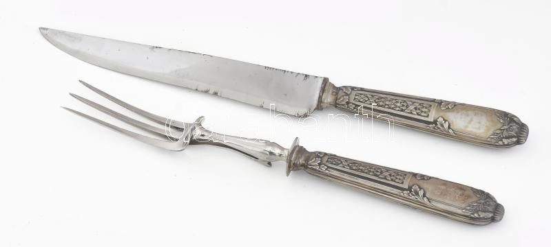 Francia ezüst (Ag) nyelű hússzervírozó villa és kés. Jelzett, kopott, ...