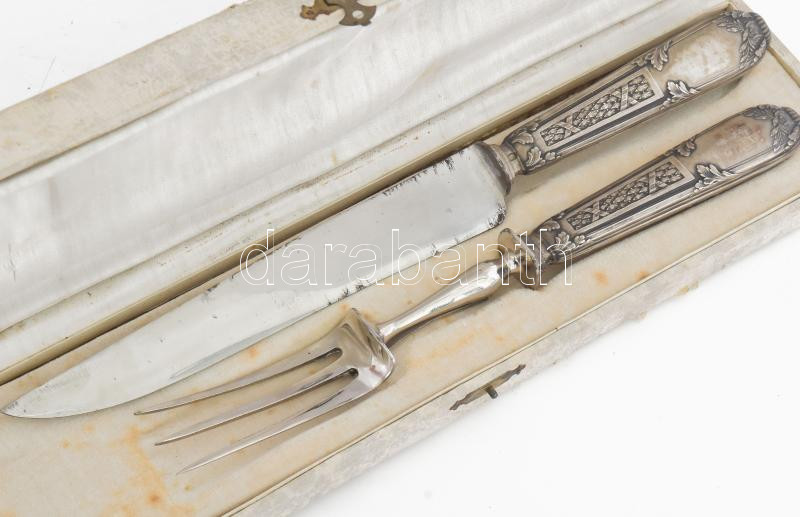Francia ezüst (Ag) nyelű hússzervírozó villa és kés. Jelzett, kopott, díszdobozban, h: 28-32 cm