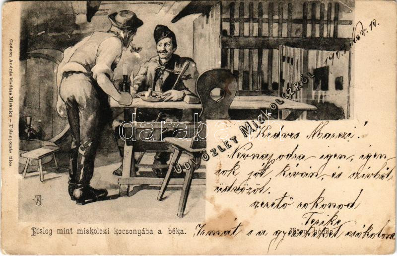 https://www.darabanth.com/en/485-Online-auction/485.0/Postcards/Hungary~1500005/1903-Miskolc-Pislog-mint-miskolczi-kocsonyaban-a-beka-Kiadja-Gedeon-A-humoros-folklor~II3269192