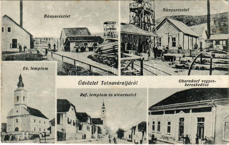 1935 Váralja, Tolnaváralja; Bánya részlet, evangélikus és református templom, utca, Oberndorf vegyeskereskedés üzlete. Steegmüller (EB)
