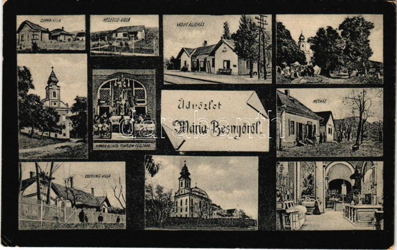 Máriabesnyő (Gödöllő), Cserna villa, Hegedüs villa, vasútállomás, Kegytemplom, főoltár, Eberling villa, Hétház. Reich Miksa kiadása (EK)