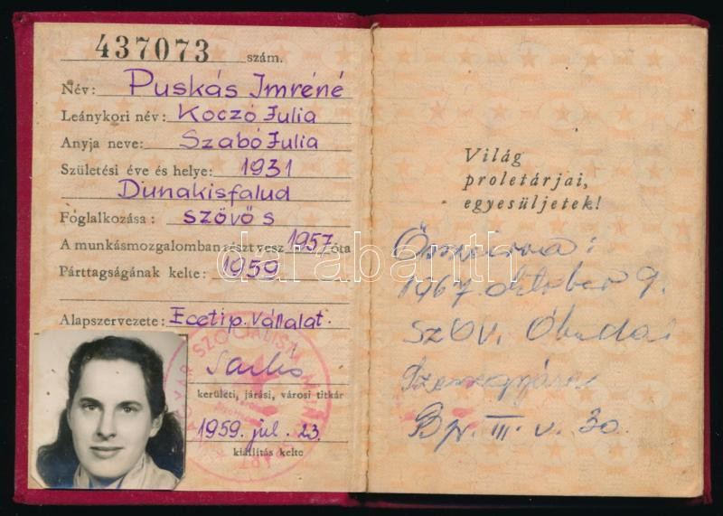 https://www.darabanth.com/en/486-Online-auction/486.0/Art-and-other-collectibles/Documents~2500026/1959-MSZMP-tagsagi-konyv-Sarlos-Istvan-az-Orszaggyules-volt-elnoke-sajat-kezu-alairasaval~II3325353