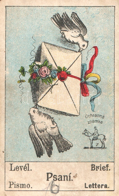 28 lapos vetőkártyacsomag, magyar, szerb, horvát, német és olasz feliratokkal (1920 körül). (Hiányos!) [Prága] Praha, [1910 körül]. Ferdinand Piatnik Synove. 28 színes lap, méretűk: 84x52 mm. A Piatnik játtékkártya kiadó csehországi üzemében készült jóskártyacsomagunk hagyományosan több nyelven feliratozott, az Osztrák-Magyar Monarchiában használatos magyar, szerb, horvát, német és olasz nyelvű játékosok számára készült. A jóskártyacsomag hagyományosan 36 színes lapból áll, de ismeretesek 32 lapos változatok, melyek nem tartalmazzák a látogatás, veszteség, kevés pénz és szerelem lapokat. Példányunk a 32 lapos változat négy lap híján teljes lapkészletét tartalmazza. Kártyacsomagunk tartalma a hagyományos számozás szerint: 1 kedves -- 2 szerető -- 3 özvegyember -- 4 özvegyasszony -- 5 vágy -- 6 főhadnagy [hiányzik] -- 7 bíró -- 8 pap -- 9 hír -- 10 remény -- 11 gondolatok [hiányzik] -- 12 szomorúság -- 13 véletlen öröm -- 14 vígság -- 15 szerencse -- 16 gyermek -- 17 betegség -- 18 látogatás [a 36 lapos változat része] -- 19 veszteség [a 36 lapos változat része] -- 20 ház -- 21 hamisság -- 22 utazás -- 23 pénz -- 24 kevés pénz [a 36 lapos változat része] -- 25 ellenség -- 26 tolvaj -- 27 halál -- 28 ajándék -- 29 szerencsétlenség -- 30 bosszúság [hiányzik] -- 31 hűség -- 32 féltékenység -- 33 levél -- 34 állandóság -- 35 szerelem [a 36 lapos változat része] -- 36 házasság [hiányzik]. A lapok alján kézi számozás, egy lapon apró sérülés, egy lapon kisebb gyűrődés. Jó állapotú lapok, enyhe használat nyomaival.