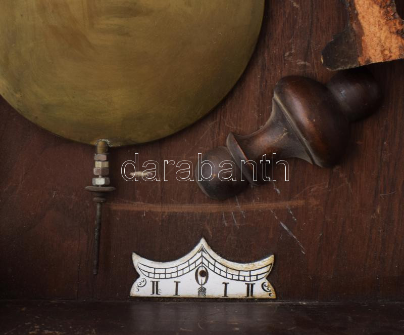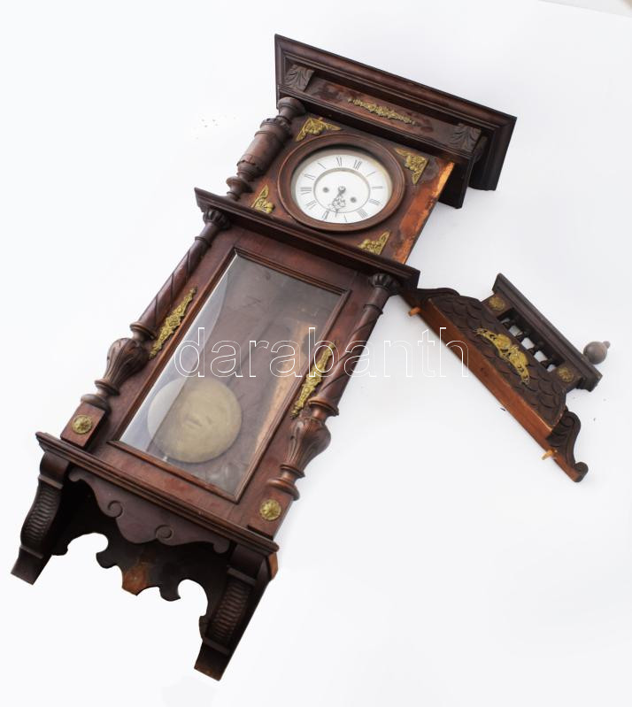 Description: Szecessziós felesütős falióra. Fa tok, porcelán számlappal, szecessziós réz veretekkel, elemhiányokkal, több levált eleme benne található, elválással, 103x47 cm /// SZEMÉLYES ÁTVÉTEL, NEM POSTÁZZUK / ONLY PERSONAL COLLECTION IN OUR OFFICE!