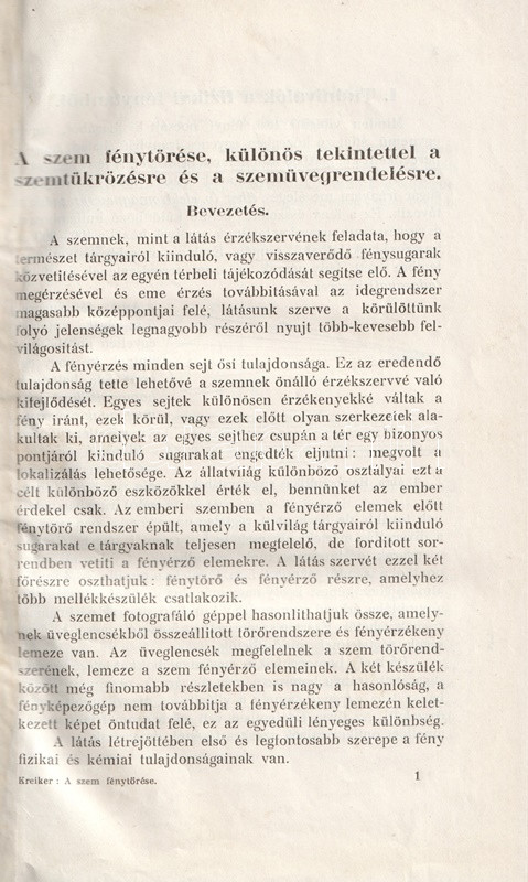 Kreiker Aladár: A szem fénytörése. Különös tekintettel a szemtükrözésre és a szemüveg-rendelésre. Gyakorlati útmutató orvostanhallgatók, iskola-, vasúti-, katona-orvosok, valamint szemorvosi pályára készülők számára. Átnézte és előszót írt hozzá Blaskovics László. 120 ábrával. (Dedikált.) Debrecen, 1922. Hegedüs és Sándor Irodalmi és Nyomdai Rt. VIII + 183 + [1] p. Első kiadás. Dedikált: "Méltóságos dr. Imre József egy. ny. r. tanár úrnak mély és őszinte tisztelettel: Kreiker Aladár." Kreiker Aladár (1893-1983) orvos, szemész, debreceni egyetemi tanár, a színlátás, az élettani optika, a kancsalság medicinájának szakértője. Optikai és élettani ábrákkal gazdagon illusztrált művét mesterének, Imre József szemész professzornak ajánlotta. A címlapon és a belív több oldalán régi gyűjteményi bélyegzés. Könyvtári duplum. A címlevél és a belív számos levele a gerincnél megerősítve, néhány oldalon aláhúzások. Prov.: Imre József. [Imre József (1884-1945) szemész főorvos, egyetemi tanár, a budapesti Szemészeti Klinika igazgatója. Aranyozott gerincű korabeli félvászon kötésben. Jó példány.