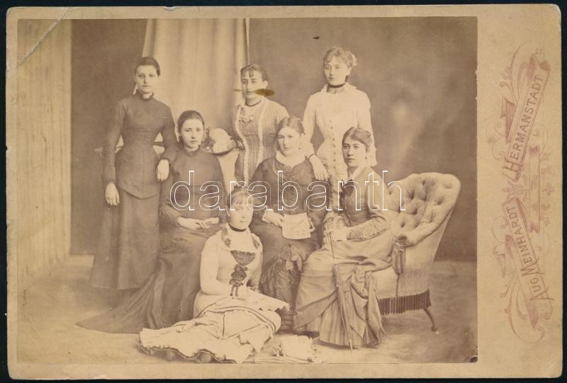 cca 1880-1890 Fiatal hölgyek, lányok csoportképe, keményhátú fotó August Meinhardt (Meinhardt Ágoston) nagyszebeni (Hermannstadt, Sibiu) műterméből, saroktöréssel, foltos, 11x16,5cm