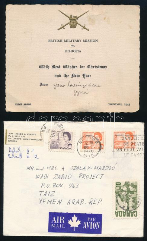 1945-70 nyomtatvány és levél, 2 db: 1945 Etiópia, Brit Katonai Misszió (Ethiopia, British Military Mission) újévi dombornyomottköszöntő kártyája, "Your loving son Gyuri" autográf aláírással + Kanadai magyar levele Jemenbe, magyar címzetthez, magyar nyelven