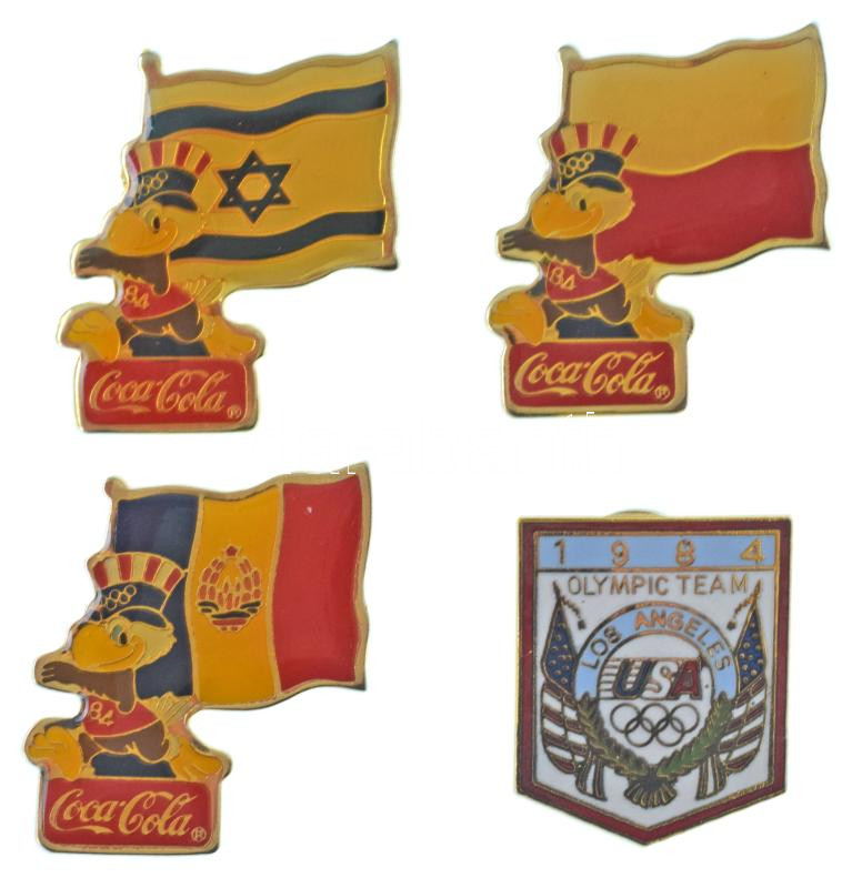 Amerikai Egyesült Államok 1984. "Résztvevő országok - Los Angeles" műgyantás fém olimpiai jelvény (3xklf: Izrael, Lengyelország, Románia) + "Egyesült Államok olimpiai csapata 1984, Los Angeles" zománcozott fém jelvény T:UNC,AU USA 1984. "Participating countries - Los Angeles" resin metal Olympic badges (3xdiff: Israel, Poland, Romania) + "USA Olympic Team 1984, Los Angeles" enamelled metal badge C:UNC,AU