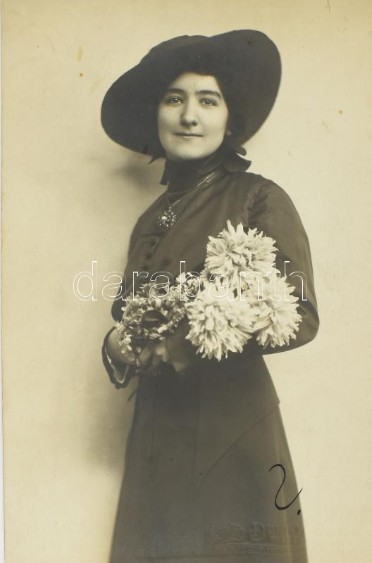 1916 Hölgy virágcsokorral, fotólap, portréfotó Dunky Fivérek kolozsvár...