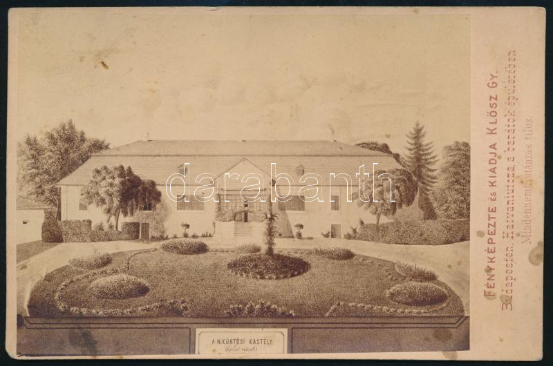 Description: cca 1880-1900 Nagykürtös (Veľký Krtíš), Sebastiani kastély festmény után készült fényképe. Keményhátú fotó Klösz György budapesti műterméből, kissé foltos, a hátoldalon felirattal és firkákkal, 11x16,5 cm