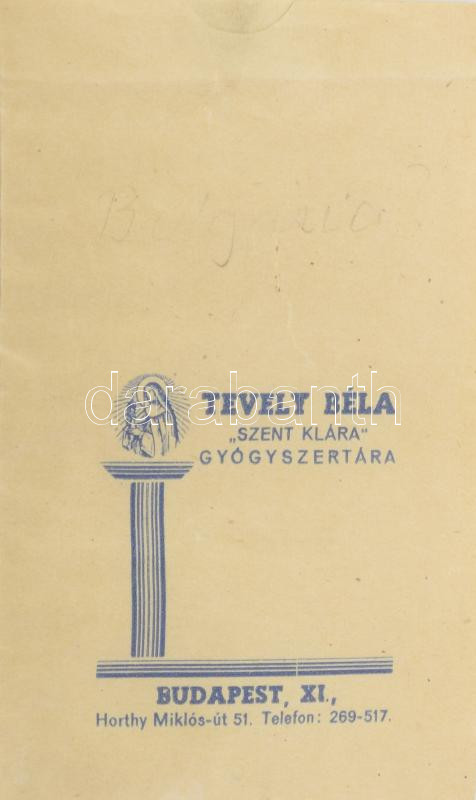 https://www.darabanth.com/en/488-Online-auction/488.0/Art-and-other-collectibles/Advertisement~1000002/cca-1940-Tevely-Bela-Szent-Klara-gyogyszertara-Bp-XI-Horthy-Miklos-gyogyszeres-zacsko-11x7-c~II3216840