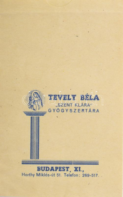 https://www.darabanth.com/en/488-Online-auction/488.0/Art-and-other-collectibles/Advertisement~1000002/cca-1940-Tevely-Bela-Szent-Klara-gyogyszertara-Bp-XI-Horthy-Miklos-gyogyszeres-zacsko-11x7-c~II3216842