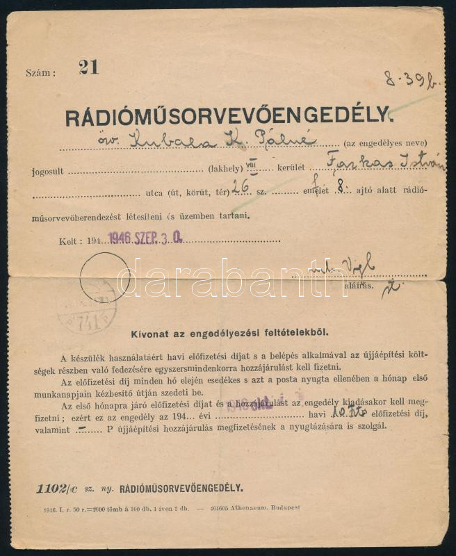 1946 Bp., rádióműsorvevőengedély, özv. Kubala K. Pálné, Kubala László ...