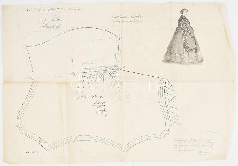 Description: 1858 Vachottfalvi Vahot Imre (Vachott) (1820-1879) ügyvéd, színműíró, lapszerkesztő autográf? kézírása Napkelet c. lapjának mellékletén (Gusztrinyi Sándor nőruhaszabási műiskolája) Nagy méretű litográfia 75x55 cm